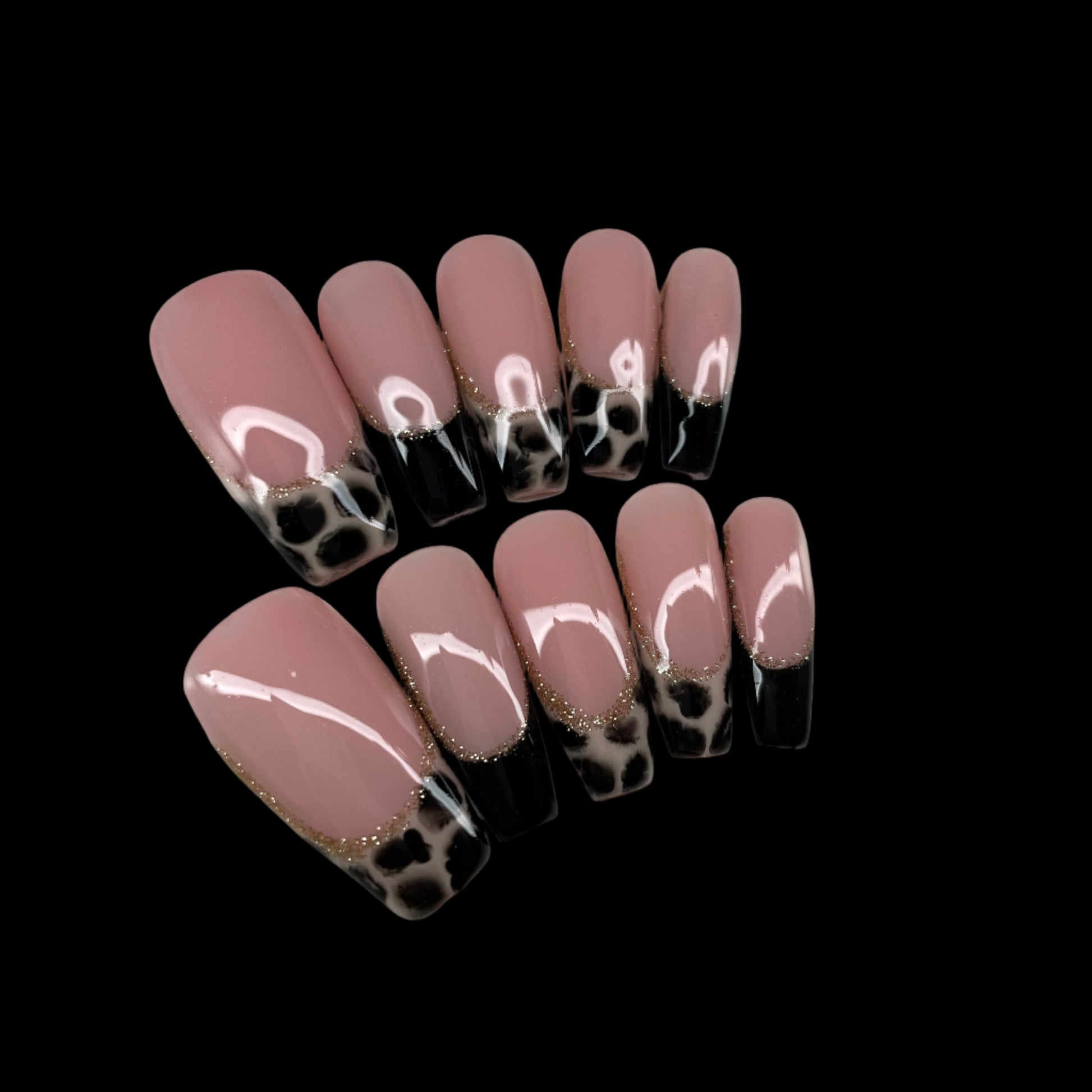 Wild Rose célèbre l’alliance parfaite entre douceur et caractère, comme un voile de satin rosé qui rencontre l’audace d’un imprimé sauvage. La base nude rosée, délicate et raffinée, révèle une féminité tendre, tandis que les pointes mêlant noir profond et motifs léopard ajoutent une touche de sensualité indomptée. Rehaussé d’un fin liseré doré scintillant, chaque ongle évoque l’élégance d’une parure précieuse où glamour et tempérament se rencontrent. Une création chic, moderne et irrésistiblement féline.
